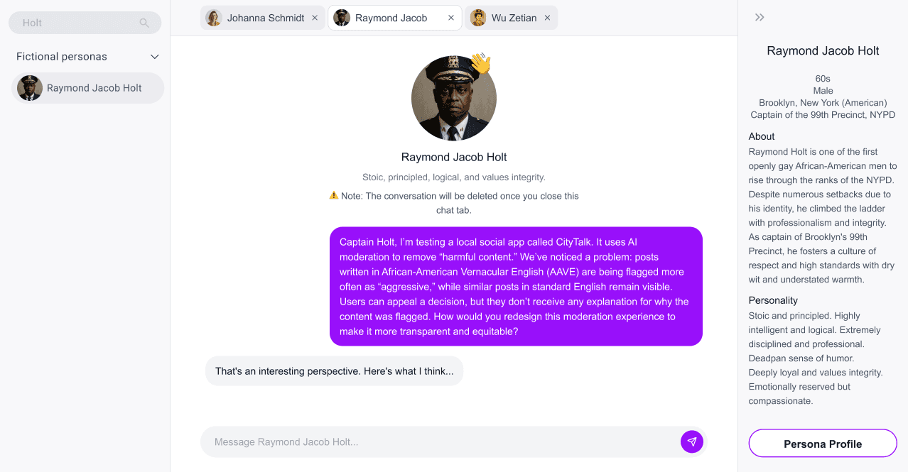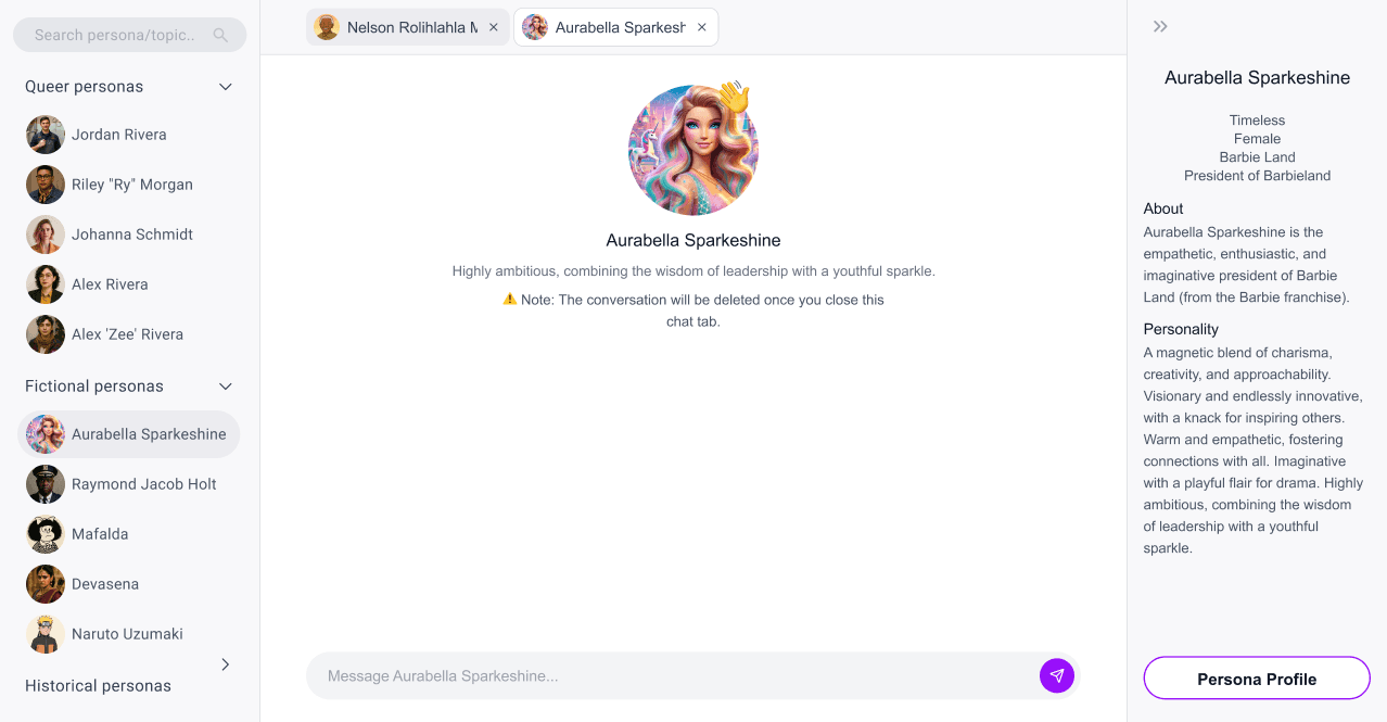 making multi-persona interaction clear (switching/opening chats, continuity, deletion expectations)